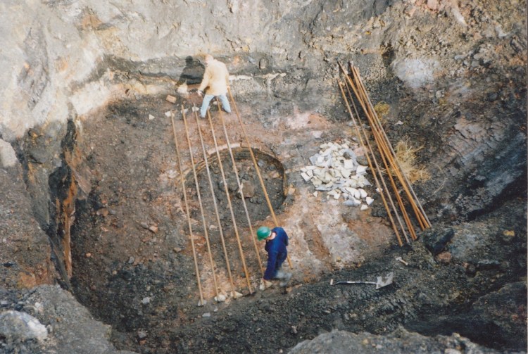 This photo shows the main Paddock Mound mine shaft being capped in 1992 See more images of the work here. Residues of iron ore and coal can clearly be seen.